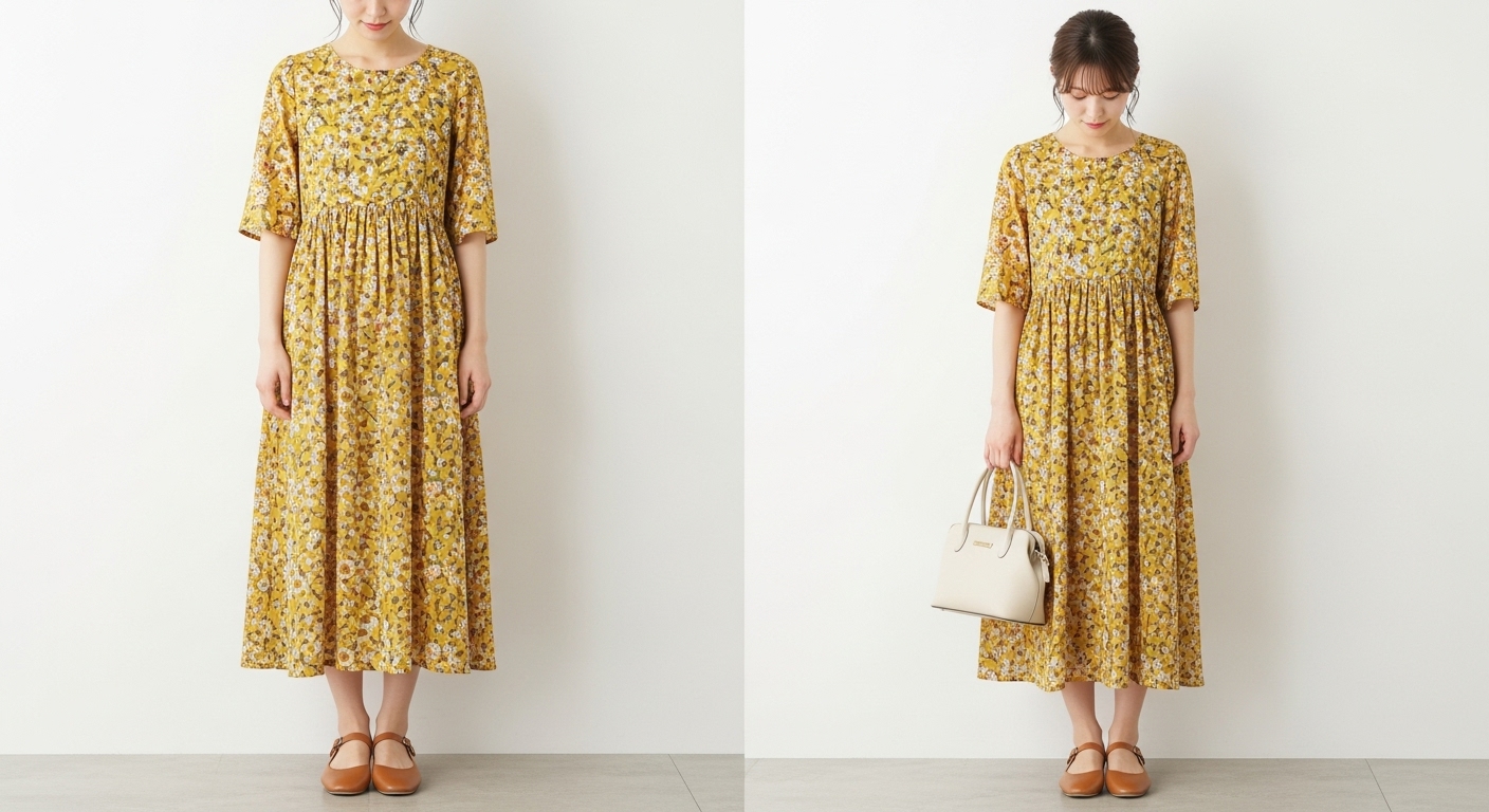 黄色の花柄ワンピースを一枚で着るか、重ね着するか迷う場面は多いものです。