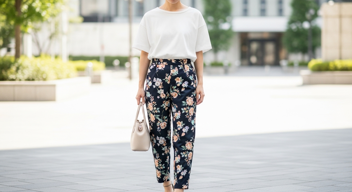 トップスやアウターの選び方次第で、花柄パンツの印象は大きく変わります!
