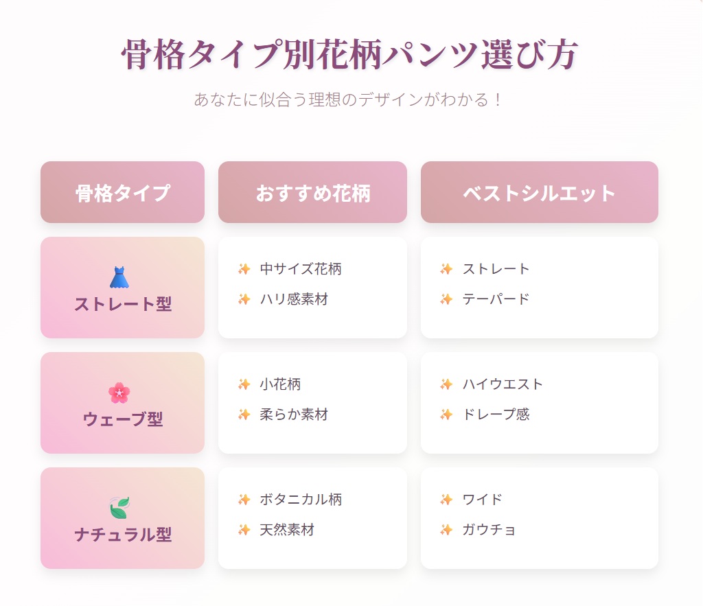 この記事では、花柄パンツが似合わない理由を徹底分析し、骨格タイプ別の選び方から体型カバーテクニック、垢抜けコーディネート術まで詳しくお伝えします。