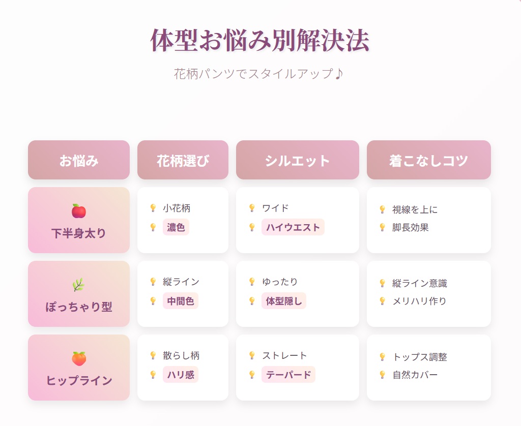 体型カバーテクニックや季節感のある着回し術を活用すれば、一年を通して花柄パンツスタイルを楽しめます。