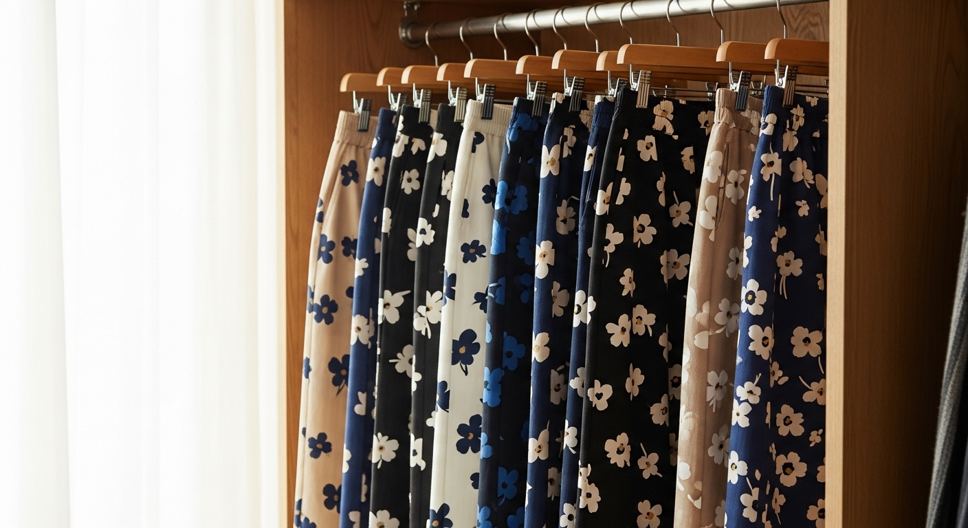 クローゼットの中の花柄パンツを前に、