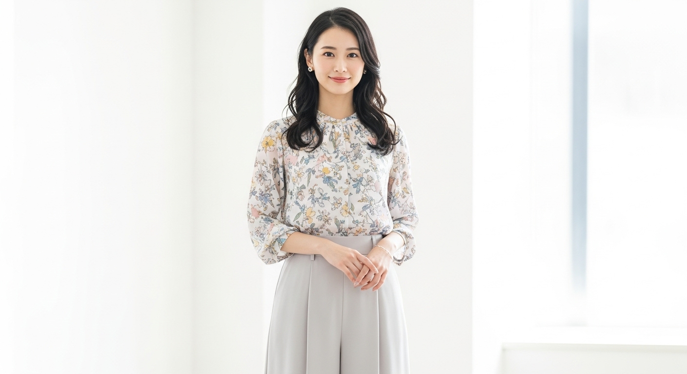 花柄ブラウスの上品で清楚な印象が、かえって学生らしさを強調してしまうことがあります...