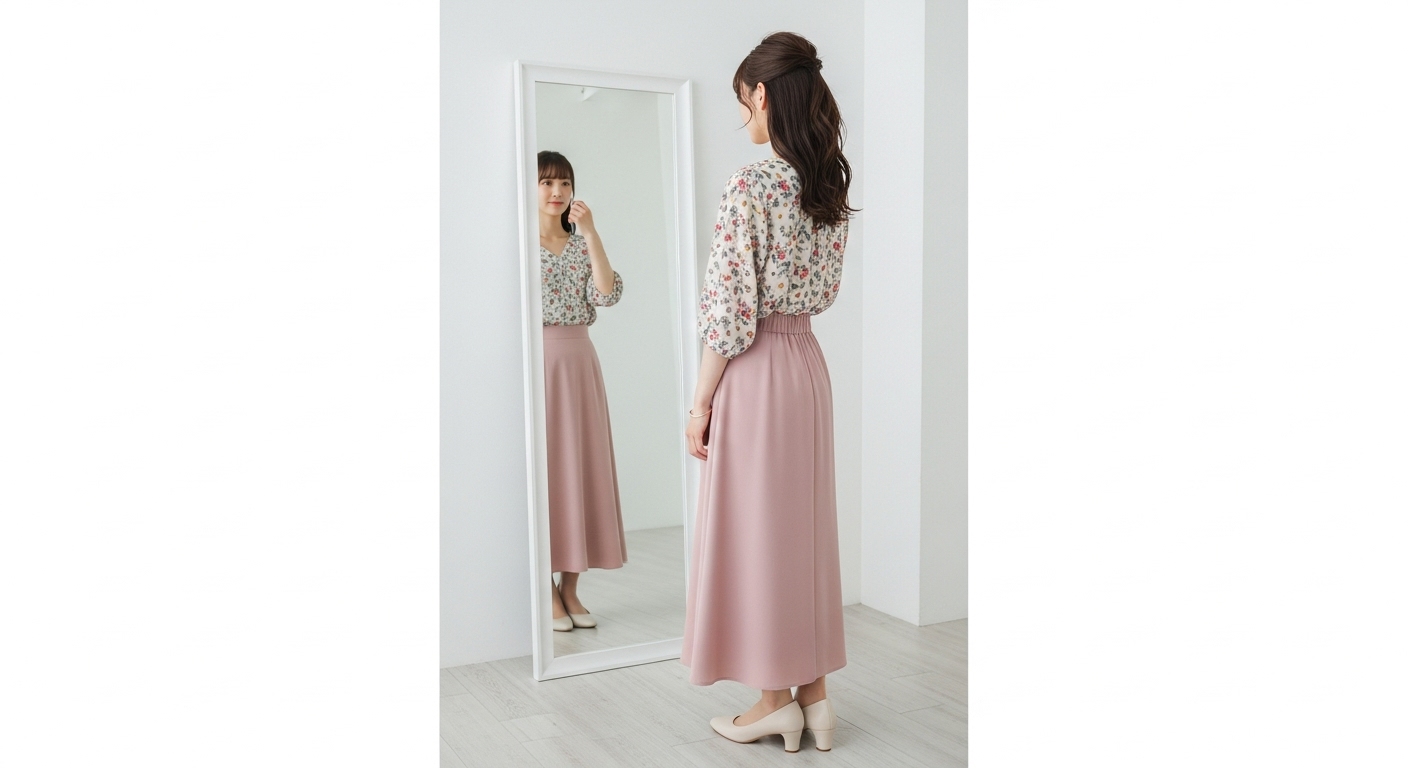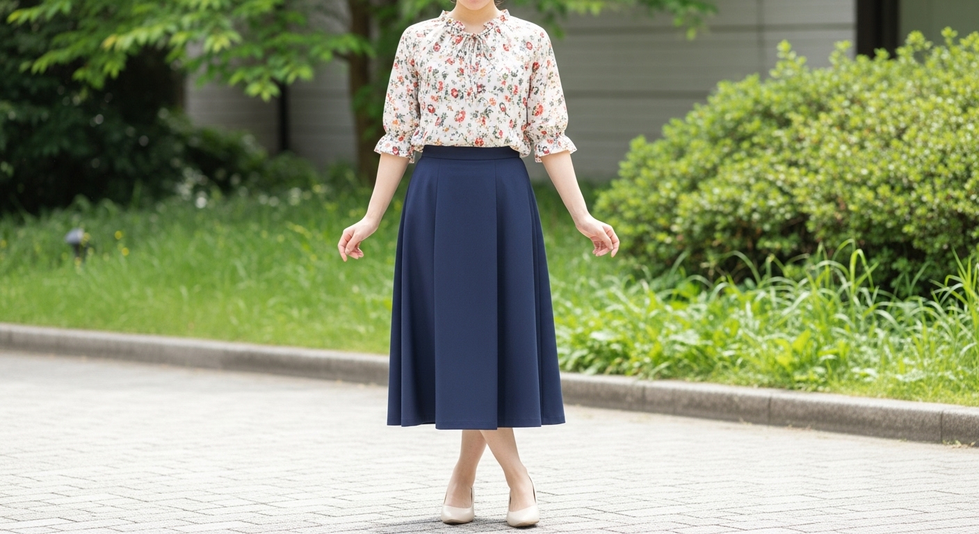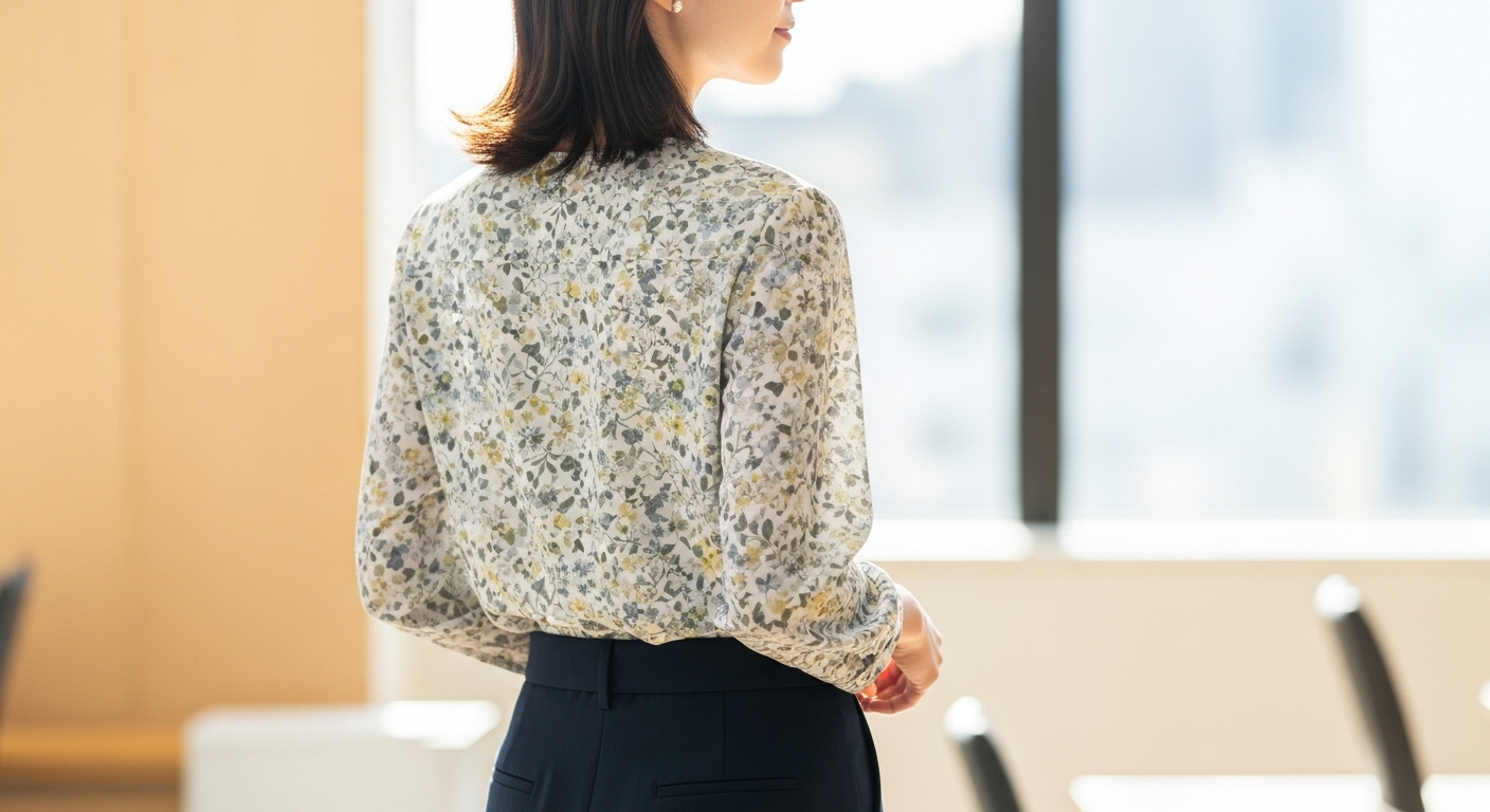 オフィスでは、花柄ブラウスにタイトスカートを合わせ、ジャケットを羽織って知的な印象を演出できます。
