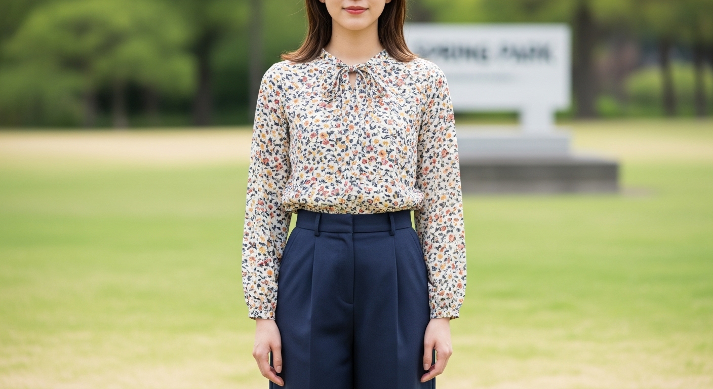 - オフィスシーン:ベージュやグレーベースの花柄で浮かずに着こなす
