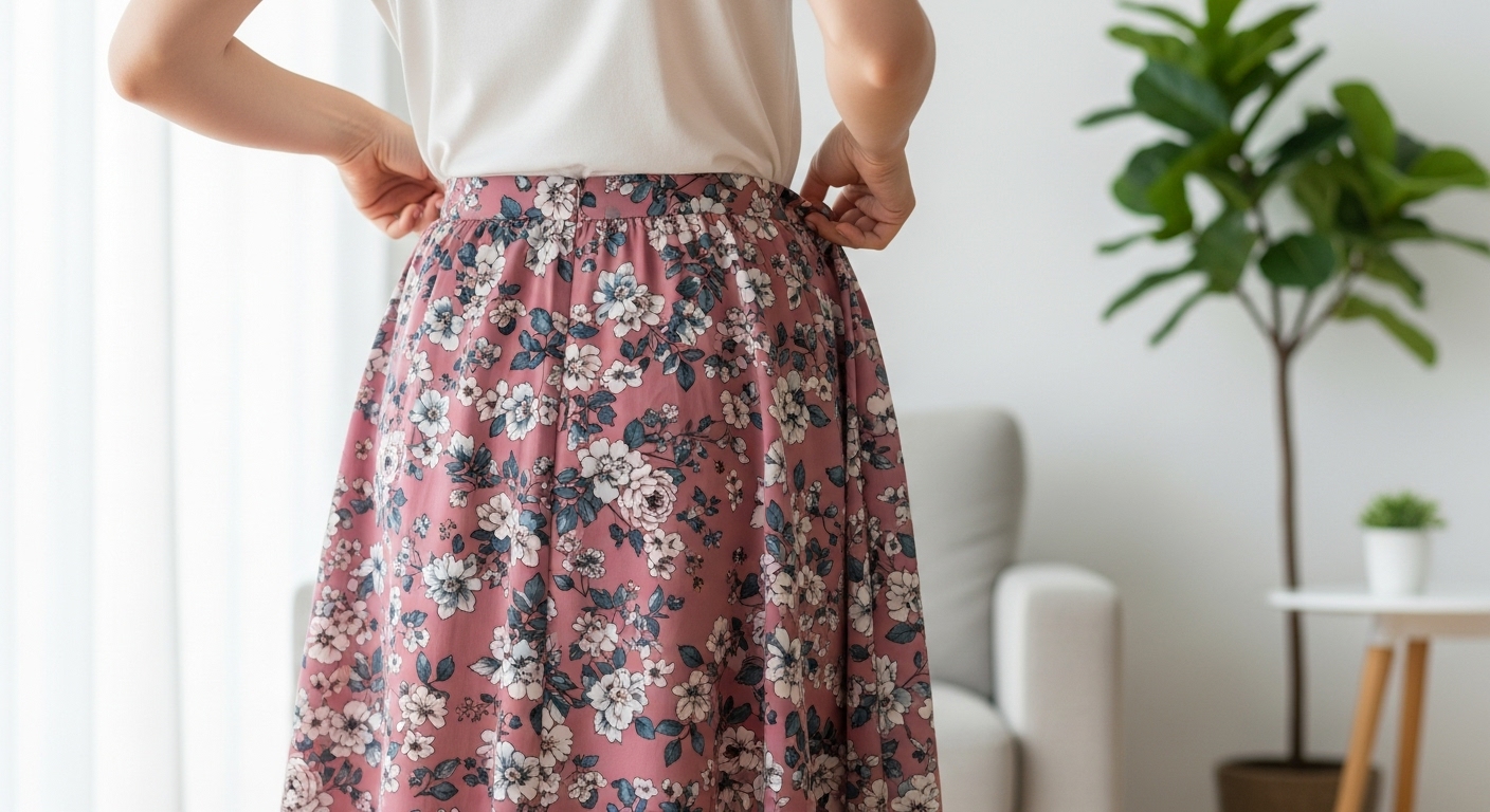 ☑ ハイウエストの花柄スカートを選ぶ → 自然とウエスト位置が高くなる