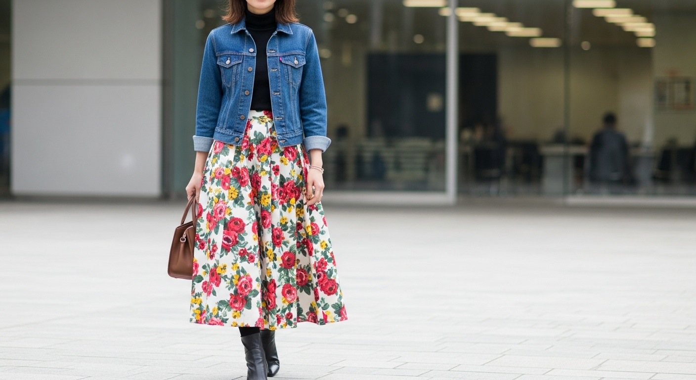 ② デニムジャケット×大花柄ミディスカート(存在感重視)