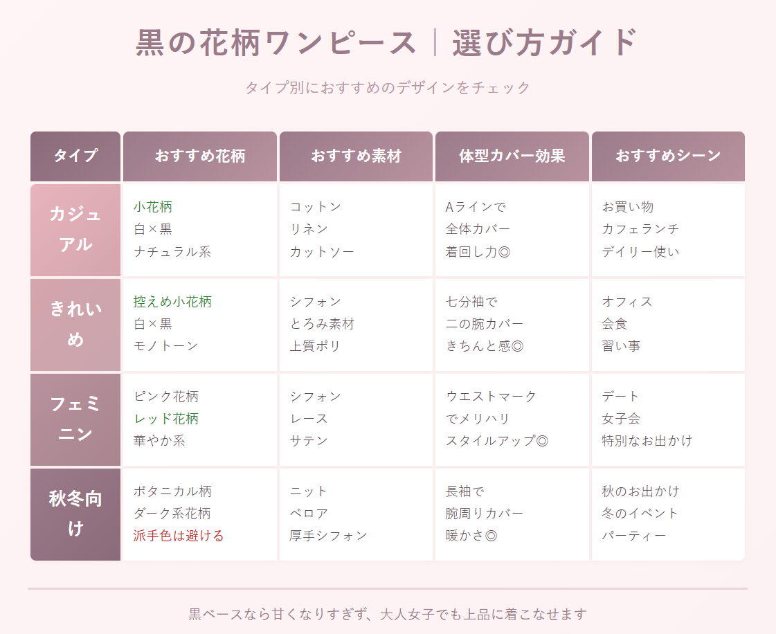 | ポイント | 黒花柄のメリット | おすすめシーン |