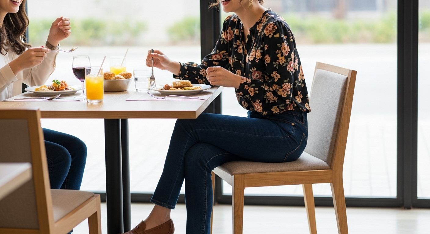 ママ友との集まりや食事会では、親しみやすさと上品さを両立したコーディネートが理想的です。