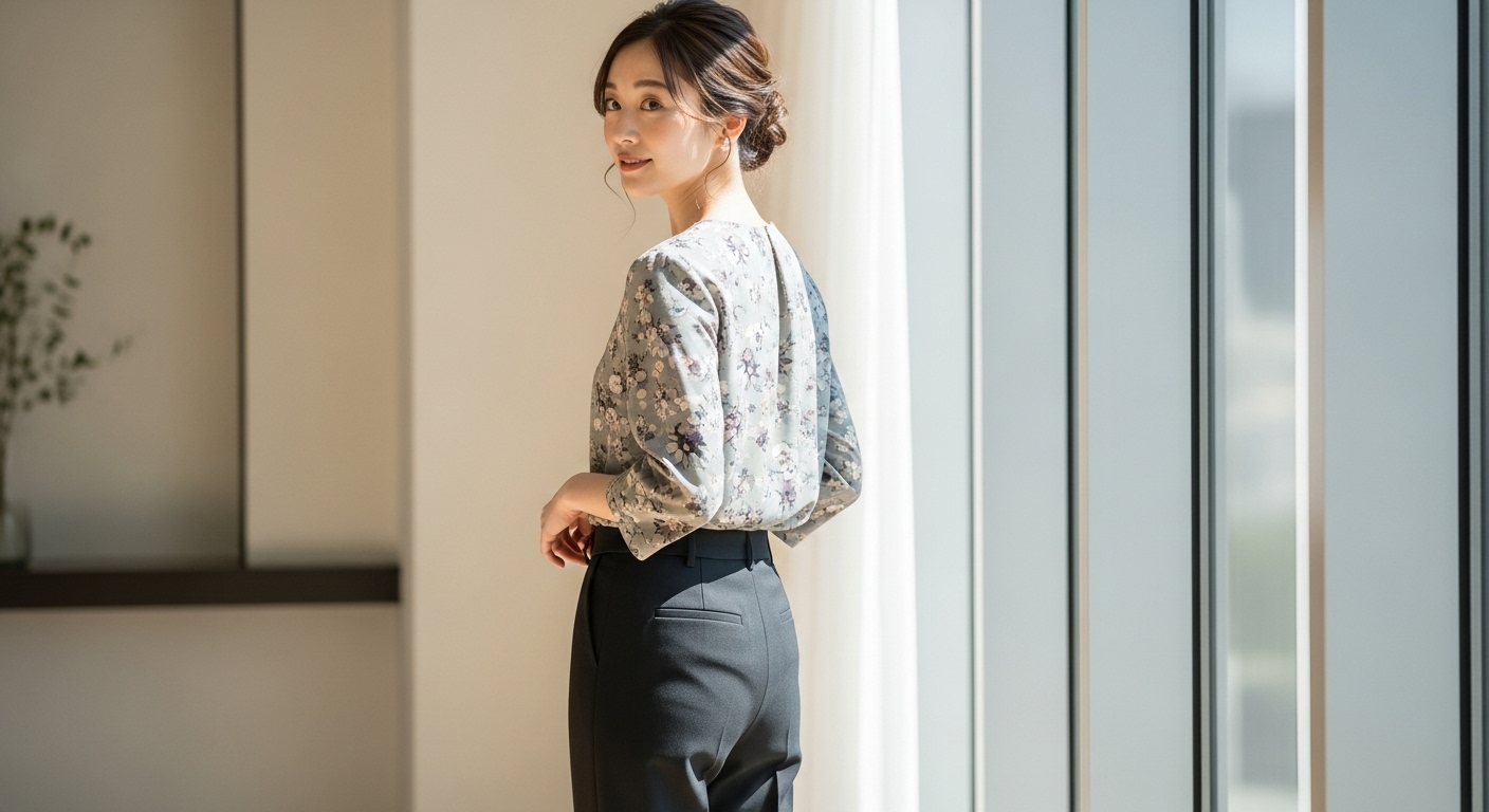 花柄ブラウスと合わせるボトムス選びは、全体のシルエットを決定する重要な要素です♪