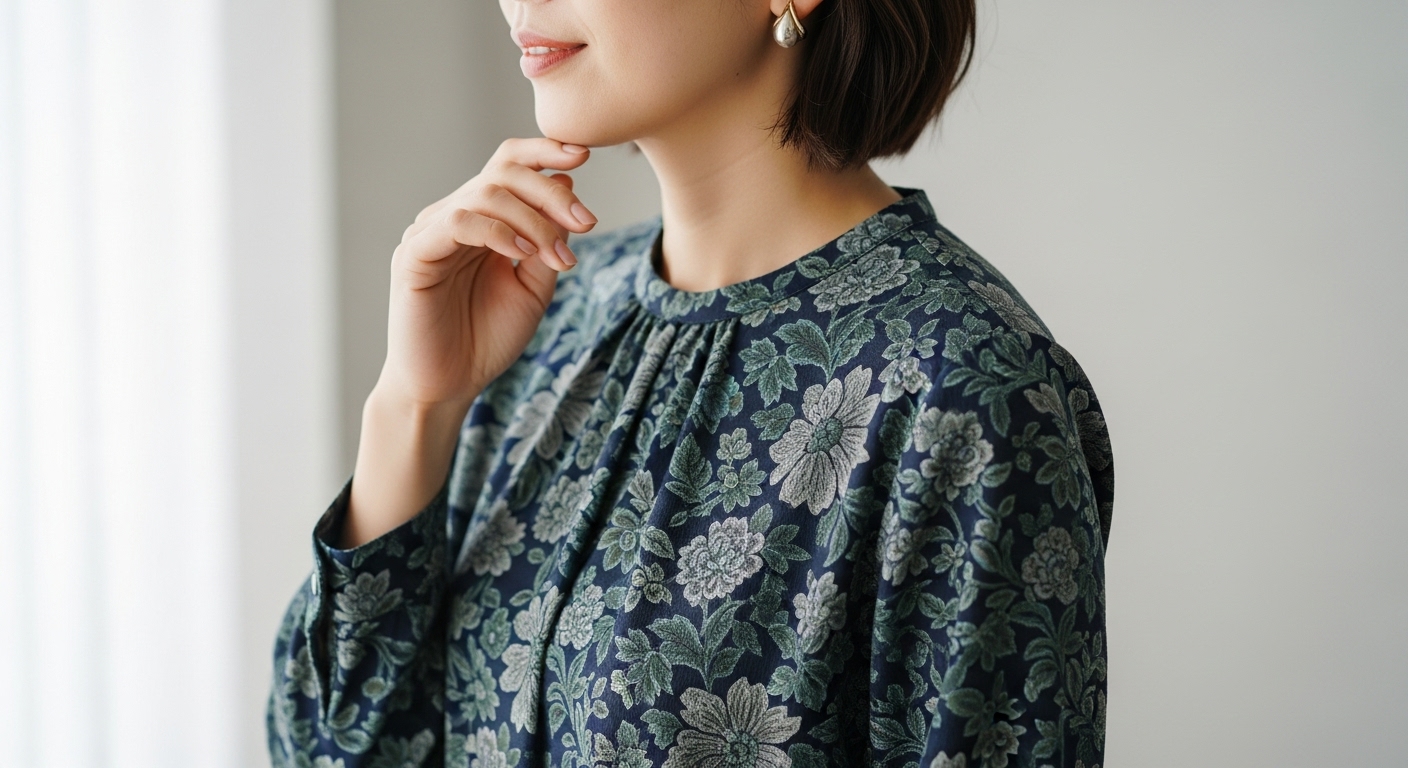 50代の女性は、品格と落ち着きのある花柄スタイルが適しています。
