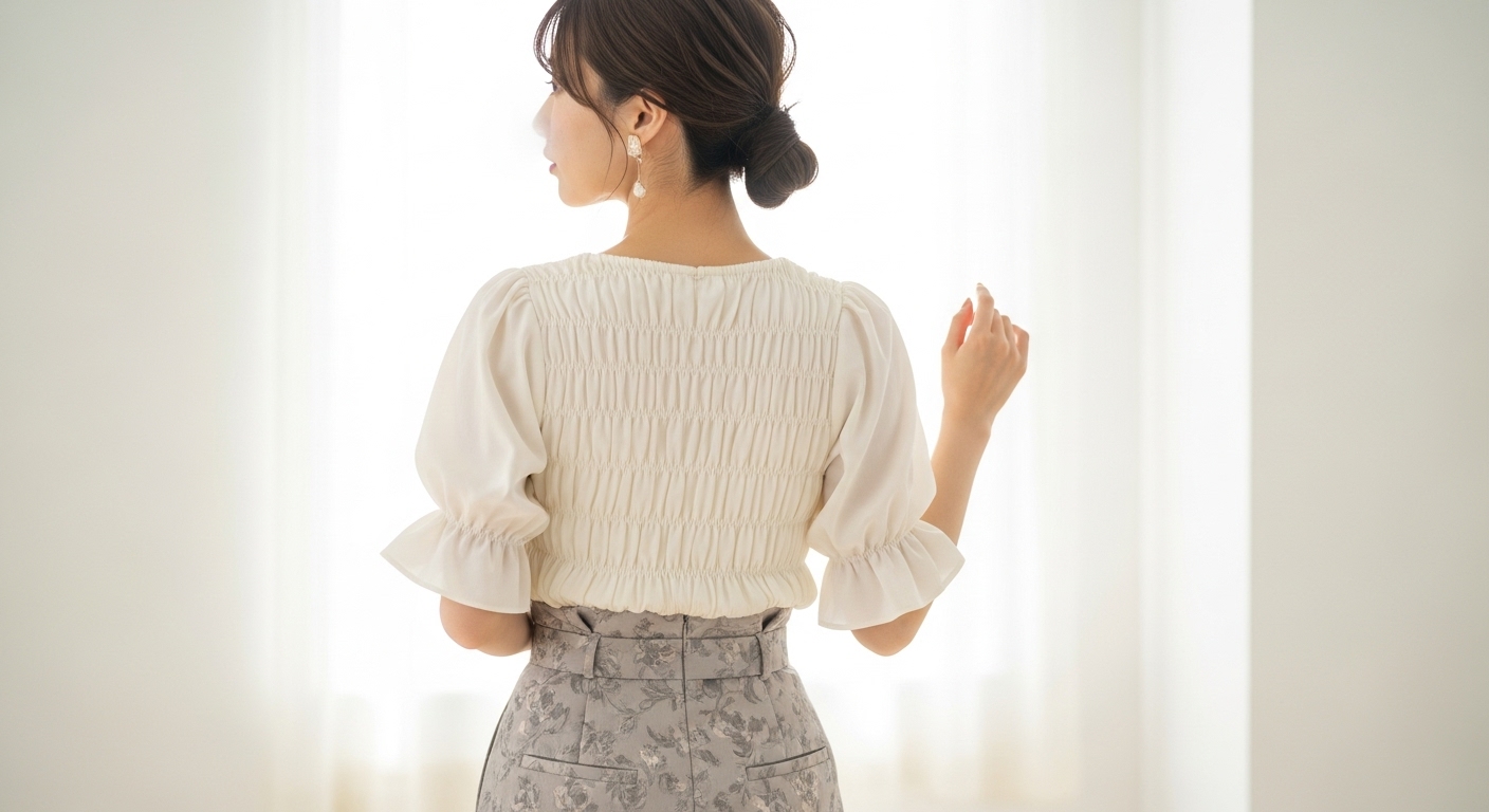 淡いトーンの花柄は、骨格ウェーブの柔らかな体型に自然に馴染みます。