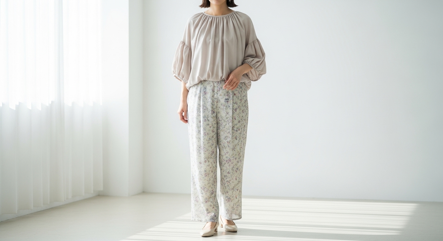 ギャザーブラウス×軽やか花柄パンツの鉄板コーデ