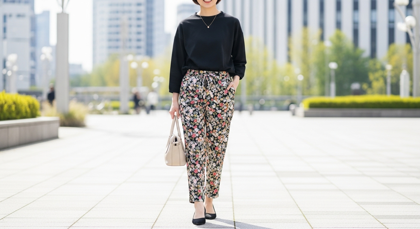 - 花柄パンツの華やかさとバランスの取れたサイズ感