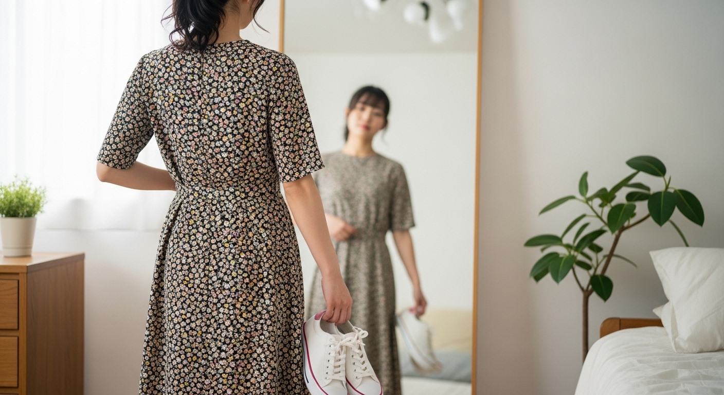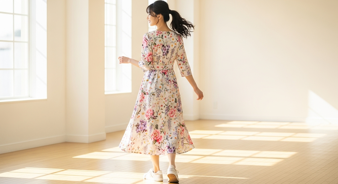 手持ちの花柄ワンピースとスニーカーで、まずは一度試してみてください。