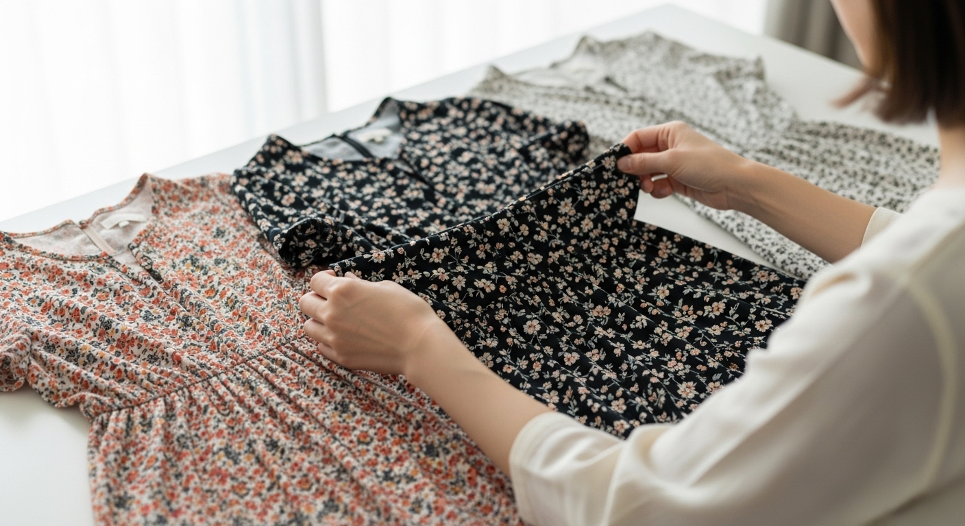 大きすぎる花柄や、横に広がる柄配置は、視覚的に体を大きく見せてしまいます。