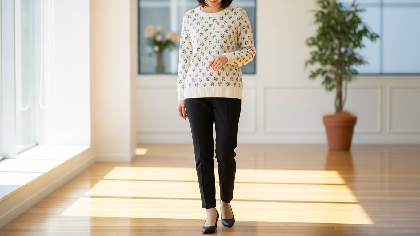 - 花柄ニット × 黒のテーパードパンツ