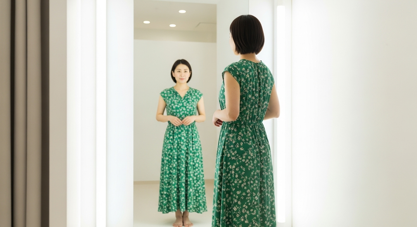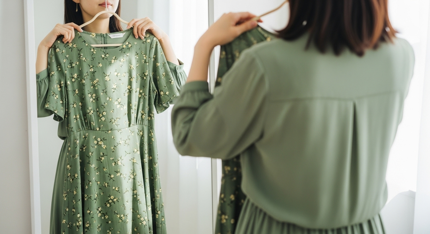 鏡の前で緑の花柄ワンピースを手に取っても、なかなか試着する勇気が出ない。