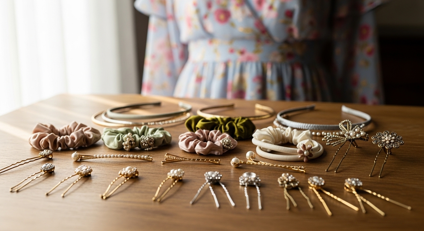 派手なヘアアクセサリーは避けて、シンプルなゴムやピンでまとめるのが無難です。
