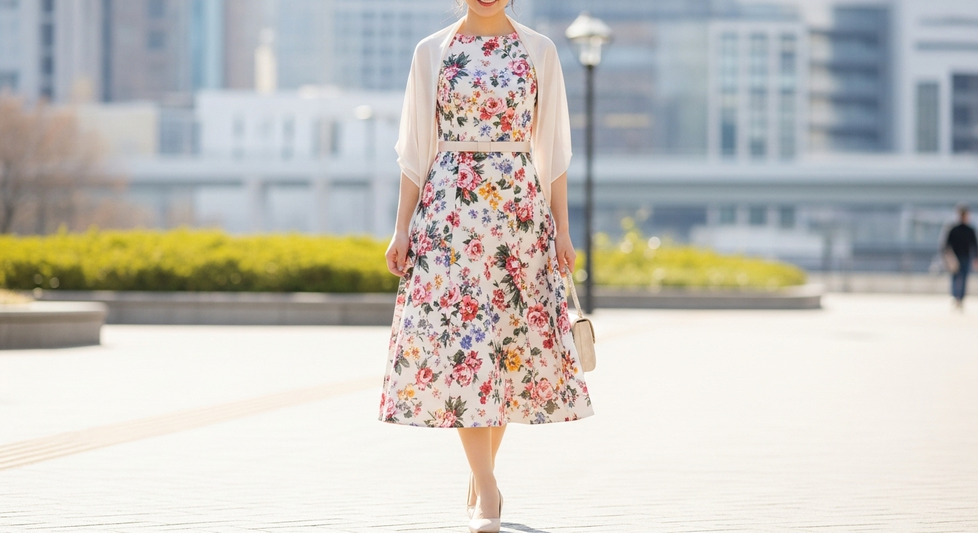 軽やかな素材の花柄ワンピースを選ぶと、季節感も出ます。