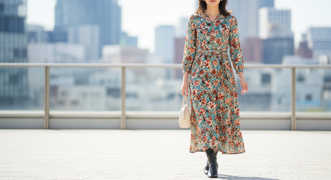 秋の花柄ワンピース基本コーディネート
