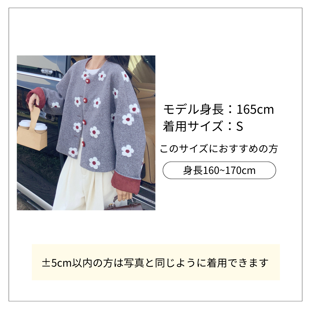 可愛らしい立体的な花々が全体に散りばめられた、花柄ファッションにぴったりの一枚です。 温かみのある素材感とコントラストカラーの袖口が特徴的な花柄ジャケットは、カジュアルにもきれいめにも着回せる優秀アイテムです。
