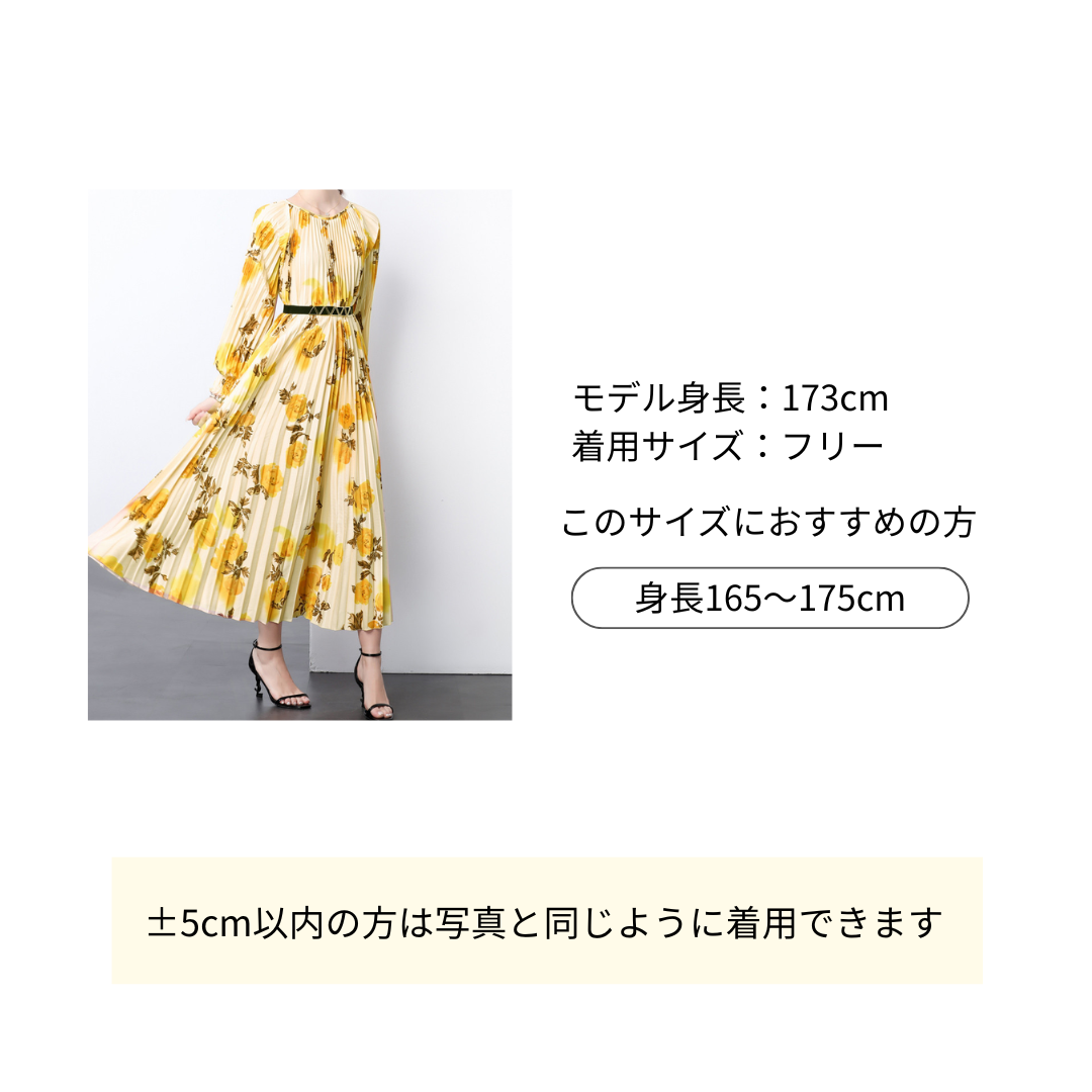 花柄ファッションの新作。上品な黄色い花が映える薄手の花柄シフォンワンピース。 細かなプリーツ加工と細身のベルトが美しいシルエットを演出し、春夏の装いを華やかに彩ります。