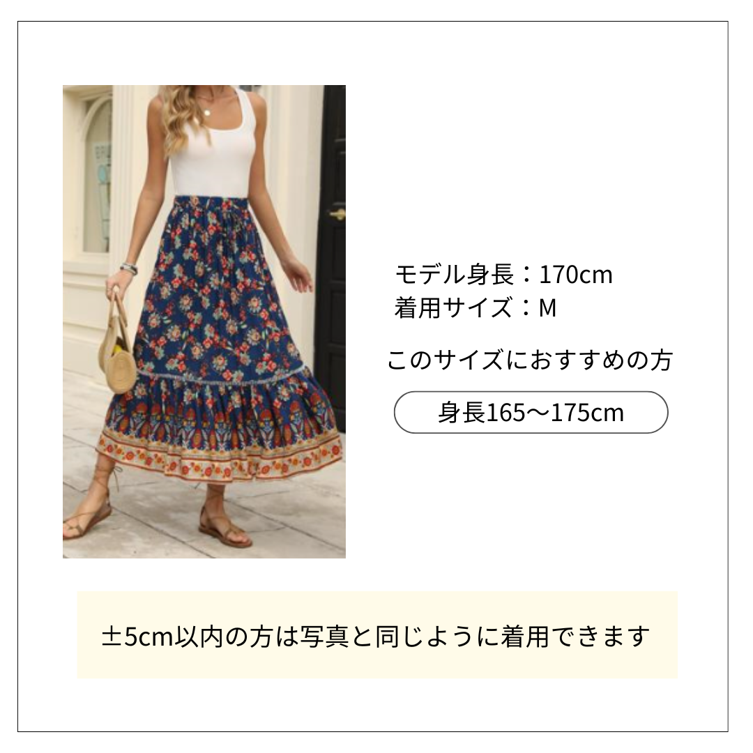 夏にぴったりの花柄ファッションアイテム。 白いタンクトップと合わせるだけで涼しげな印象に仕上がる花柄フレアースカート。 裾の民族調の装飾がおしゃれなアクセントになっています。