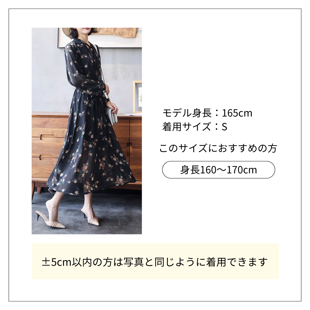 花柄ファッションの上品さを演出する優美なデザイン。 軽やかなシフォン素材に散りばめられた繊細な花柄が女性らしさを引き立てます。 首元のリボンタイと袖のフリルが華やかさを添える花柄シフォンワンピースです。
