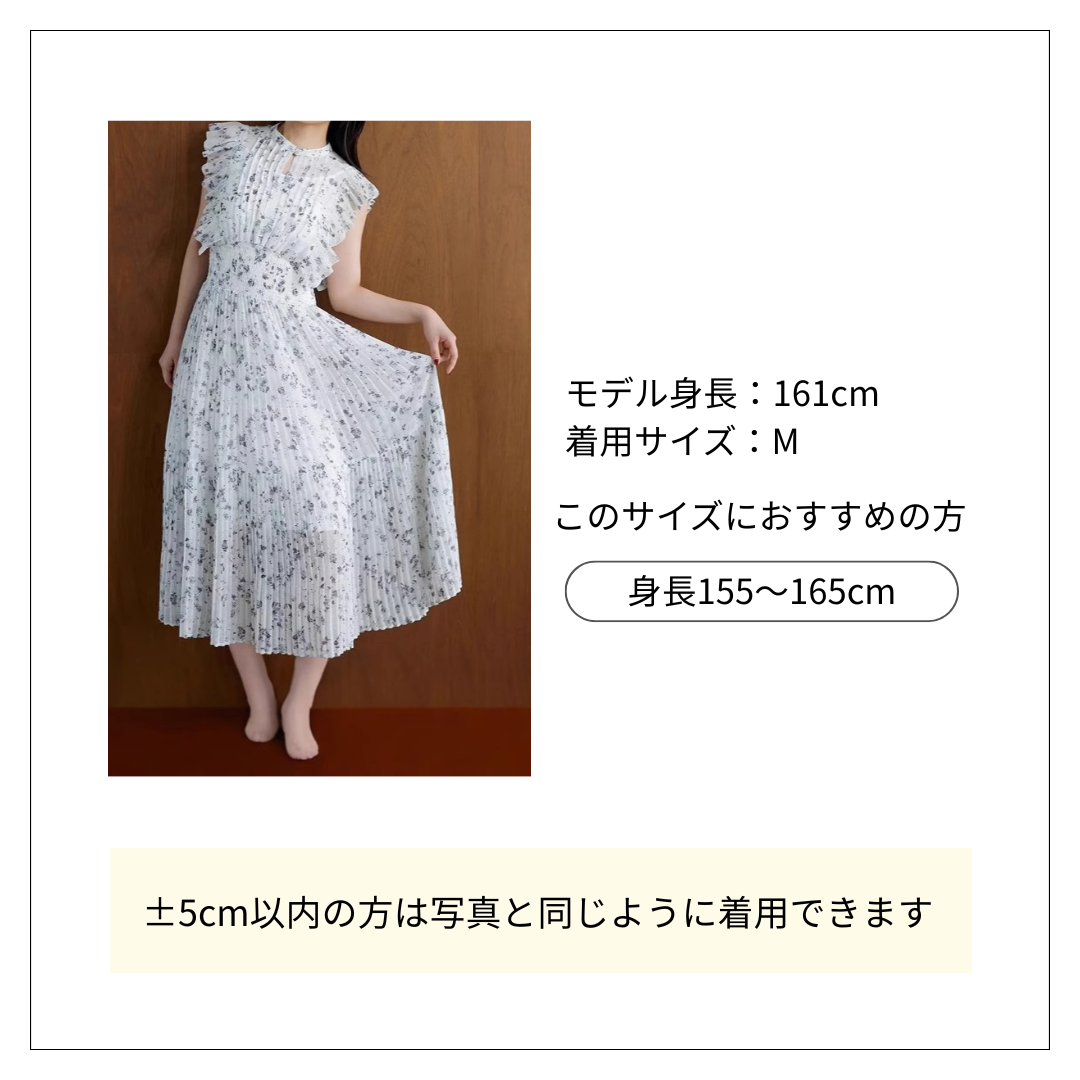 軽やかな印象の花柄シフォンワンピース。 繊細なプリーツ加工と襟元のフリルデザインが女性らしさを引き立てます。 花柄ファッションの中でも上品な雰囲気を醸し出す一着で、春夏のお出かけにぴったりです。