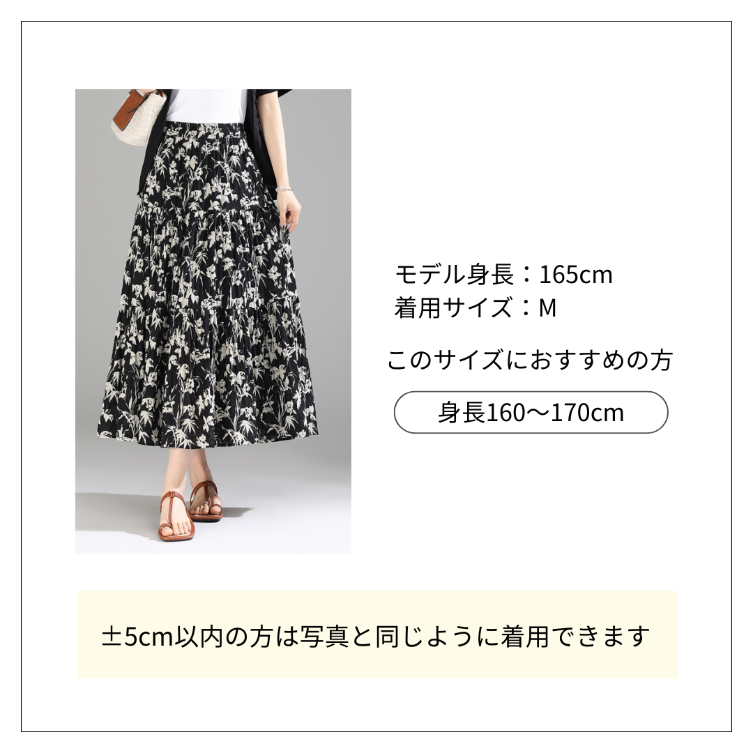 上品な花柄デザインが目を引くロングスカート。 軽やかな素材感で季節を問わず着回しができる花柄ファッションの一品。 ふんわりとしたシルエットが女性らしさを引き立てる花柄ロングスカートです。 伸縮性のあるウエスト部分で快適な着心地を実現しています。