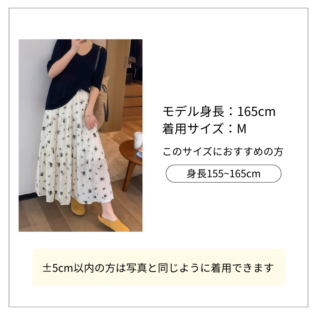 繊細な小花柄が散りばめられた白地のティアードスカート。 軽やかな素材感と三段のフリルデザインが春夏の花柄ファッションにぴったり。 花柄フレアースカートはフェミニンな雰囲気を演出しつつ、黄色の靴との相性も抜群です。