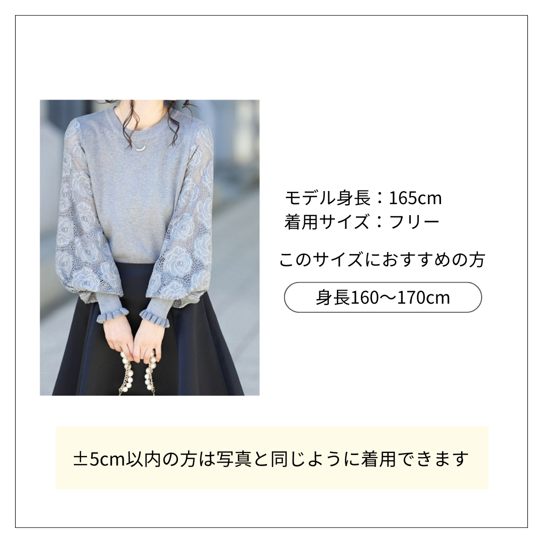 袖部分が花柄レースで女性らしい雰囲気たっぷりのブラウス。 着用するだけで上品な印象になります。