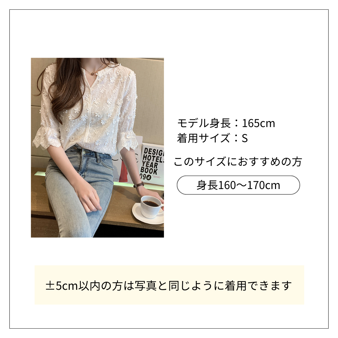 繊細な花刺繍が全体に施された上品な花柄ブラウス。 七分袖の裾に広がるレース装飾がフェミニンな雰囲気を演出します。 花柄ファッションの中でも着回しやすいデザインの花柄シャツです。