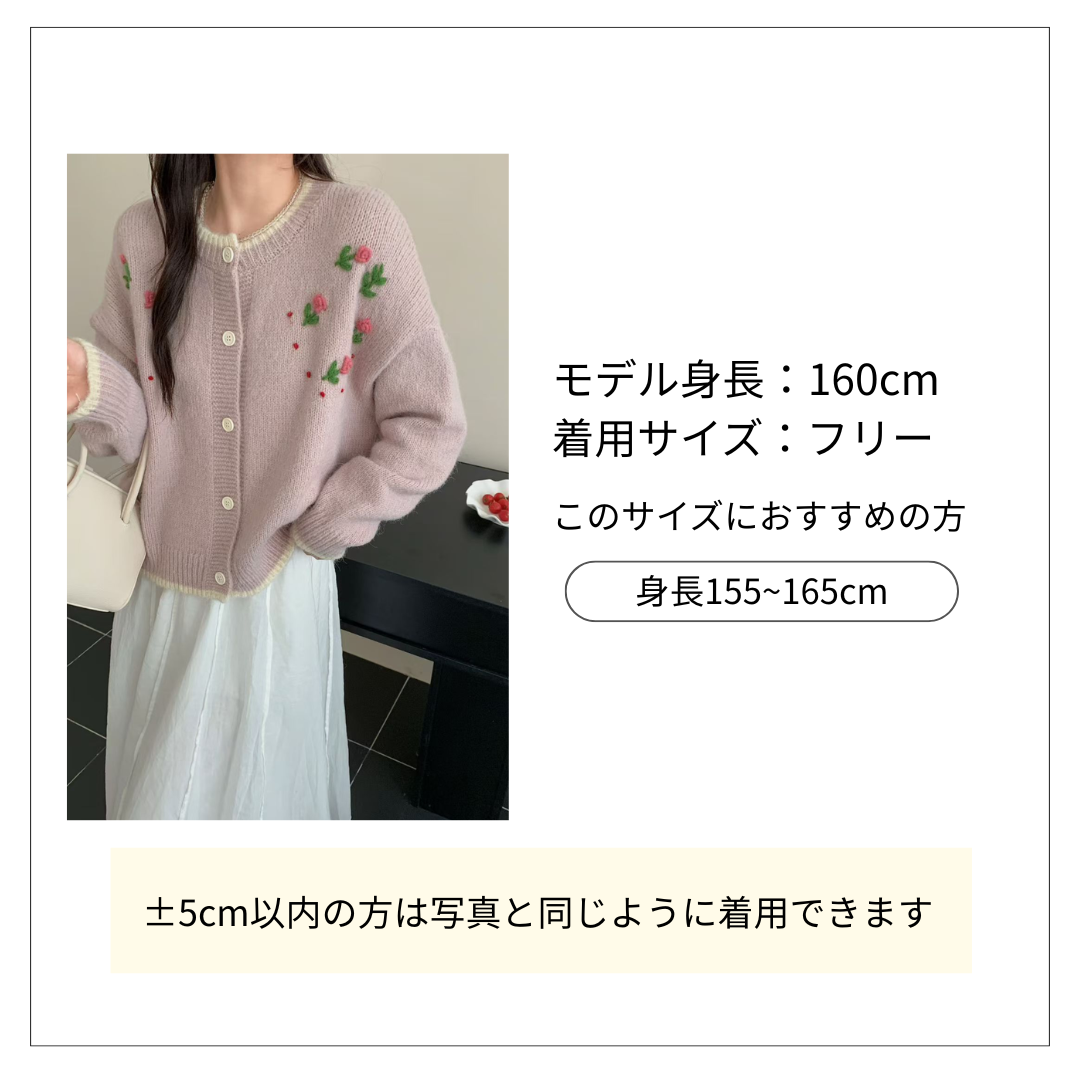 淡い色合いに可愛らしいバラ刺繍が施された花柄カーディガン。 丸首のリブ編みが顔周りを優しく彩り、ゆったりとした着心地が魅力です。 花柄ファッションの中でも上品さと可愛らしさを兼ね備えた一枚です。
