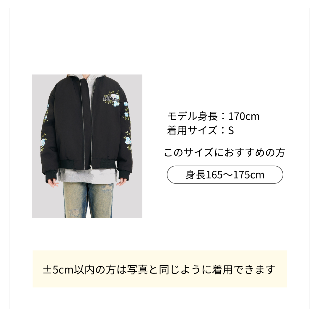 袖全体に美しい花々の刺繍を施した存在感抜群の花柄ジャケット。 胸元のロゴデザインと繊細な花柄刺繍が絶妙に調和し、カジュアルながらも上品な印象に。 花柄ファッションを楽しみたい方におすすめの、程よくゆとりのあるシルエットが今っぽい一着です。